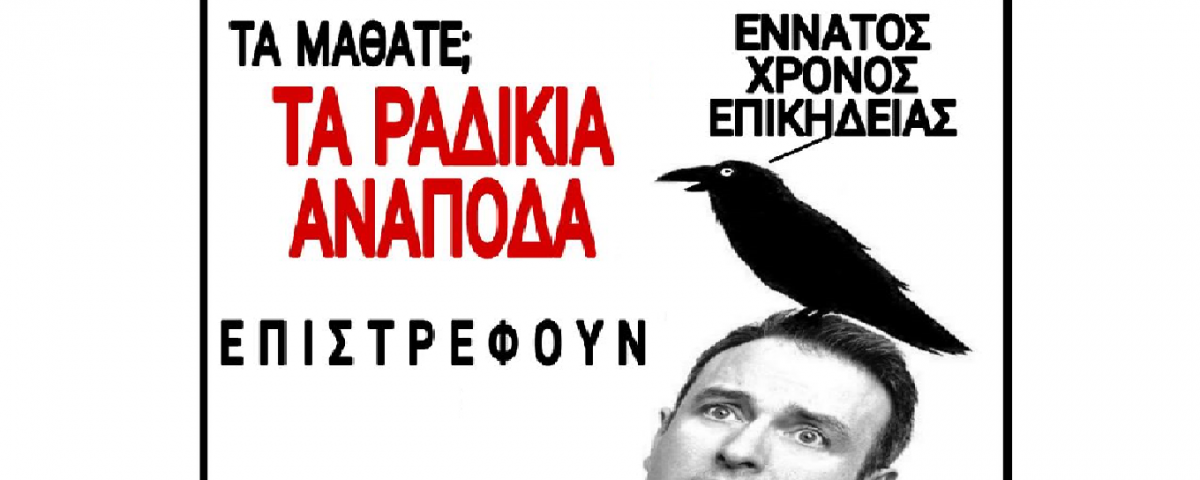 Ο ξεκαρδιστικός μονόλογος του Γιώργου Γαλίτη, δεν λέει να μας αφήσει χρόνους, να μείνει στον τόπο και να τινάξει τα πέταλα. Τώρα πια δεν τον πάνε τέσσερις αλλά εννιά. Ένατη χρόνια επικηδείας, ΈΝΑΤΗ φορά θανατερά! Γι’ αυτό ήρθε η ώρα σας να δείτε «Τα Ραδίκια Ανάποδα», σε νέο τόπο, εν τόπω χλοερώ και αναψύξεως, στο ΑLHAMBRA ART THEATRE